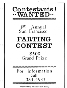 In the spring of 1989, Demetrius Toteras, Uncle Tad Baker and several members of the Northern California Collective Consciousness conspired to form the experimental theater group, The Institute of Absurdity. The Institute became the practical 'performance arm' for Toteras' Theories of Absurdity, and the group's first act was their decision to host the most unusual contest in history: a Farting Contest.